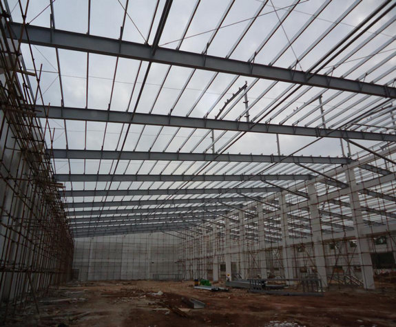 柱間支撐(有行車的下柱間支撐)的位置決定鋼結構縱向變形的方向和產生溫度應力的大小。一般設置在開間方向中部,較長方向的三分點處,并小于60米。有行車的,端部可不設下柱間支撐,以減少溫度應力。同開間設置屋面橫向支撐對應,組成一個幾何不變體系。